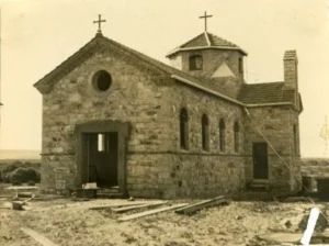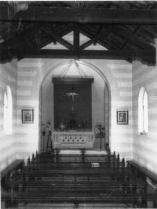 The foundation stone for St Lawrence’s was laid in 1937 by Bishop O’Collins and the building was completed  and opened on 8th August 1937. The land was donated by a Mrs Cameron and  a generous anonymous donation of  £600  from a person in the east enabled the building to go ahead.  The successful tenderer to build the church was Enrico Boschetti for the price of £1,109.  The masonry work was carried out under the supervision of Mr Joe Battistella  of  Perth and   Mr Frank Green donated the stone from his quarry at Waggrakine.